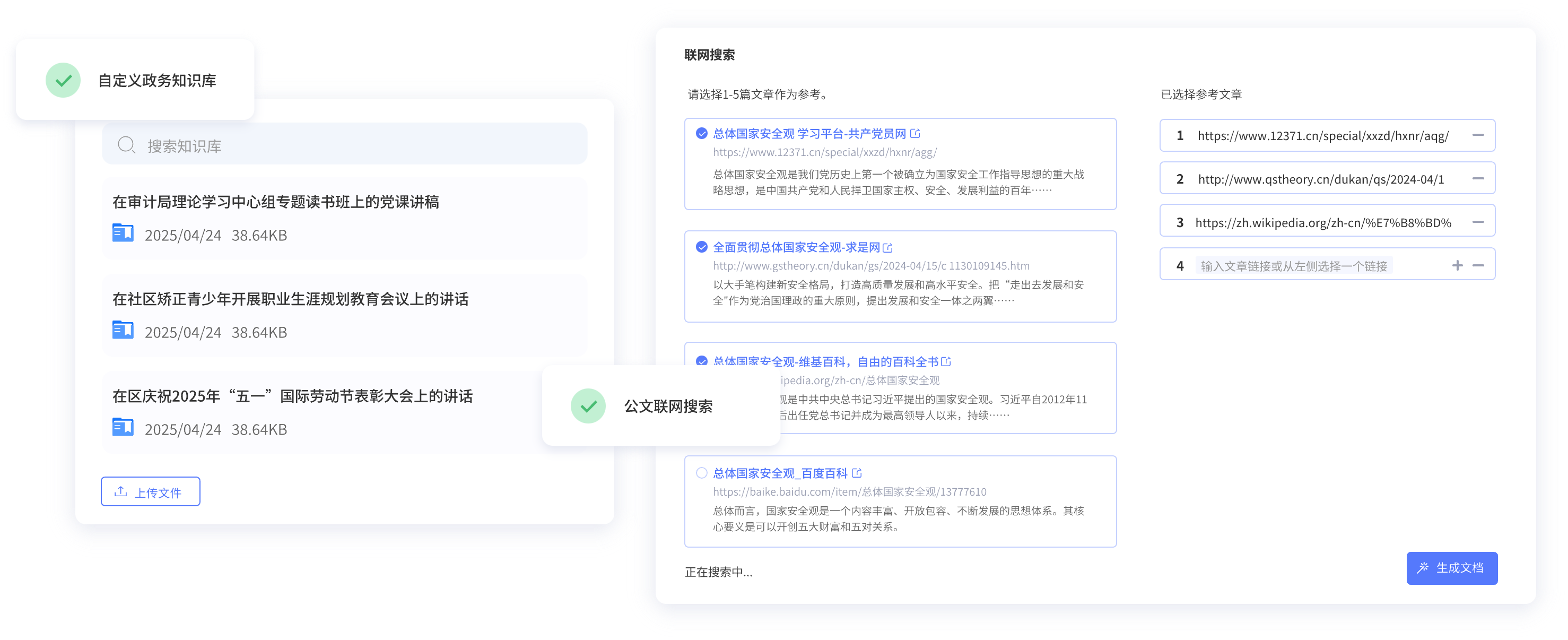 您可上傳本地文檔或?qū)⑵脚_文檔轉(zhuǎn)移至知識庫。在生成公文時,打開"知識庫參考"功能,AI即會自動匹配相關(guān)知識庫材料,生成符合您自己寫作風格的公文。